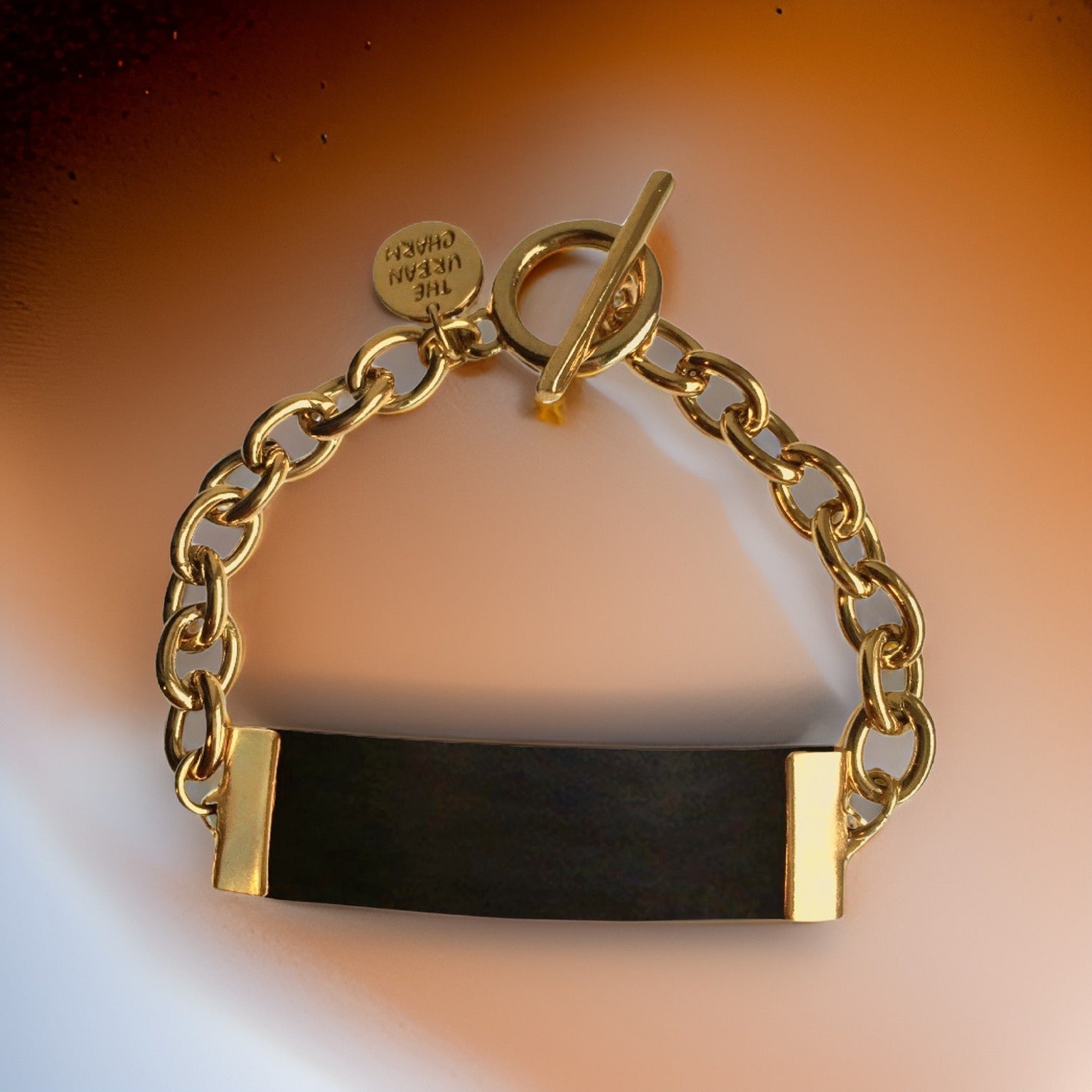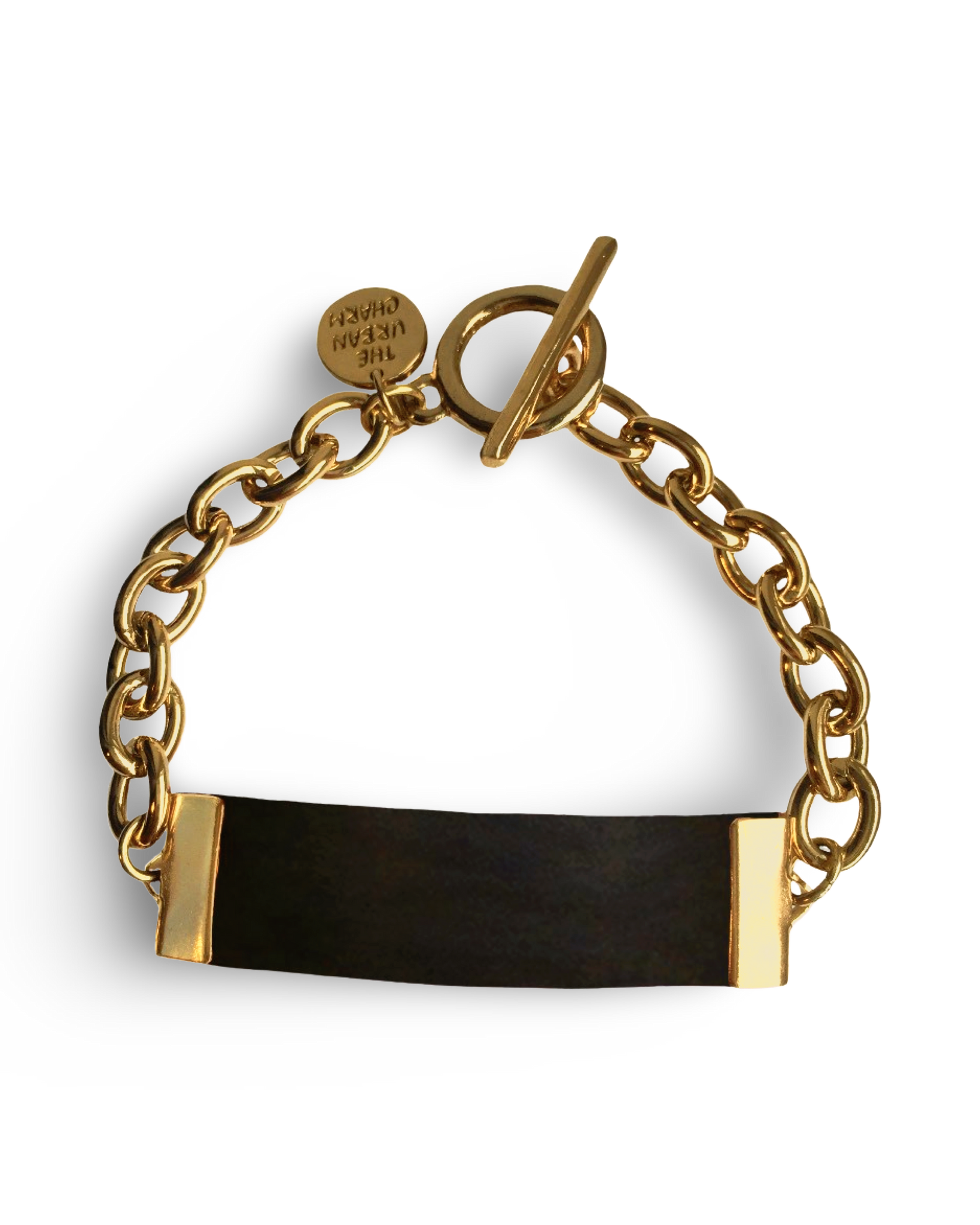 The black leather ID bracelet is our version of a modern ID bracelet. You can brand these with your initials or small name. The bracelet features genuine leather and a cable chain dipped in 24k gold or silver. It has a toggle closure for easy on and off accessibility and closed off with a branded logo charm.