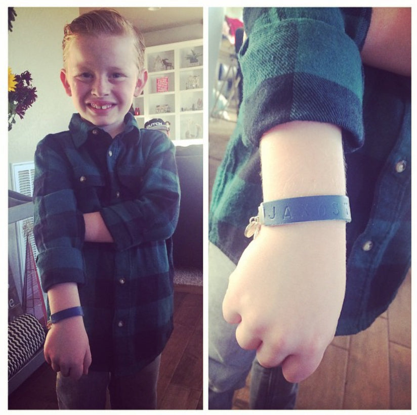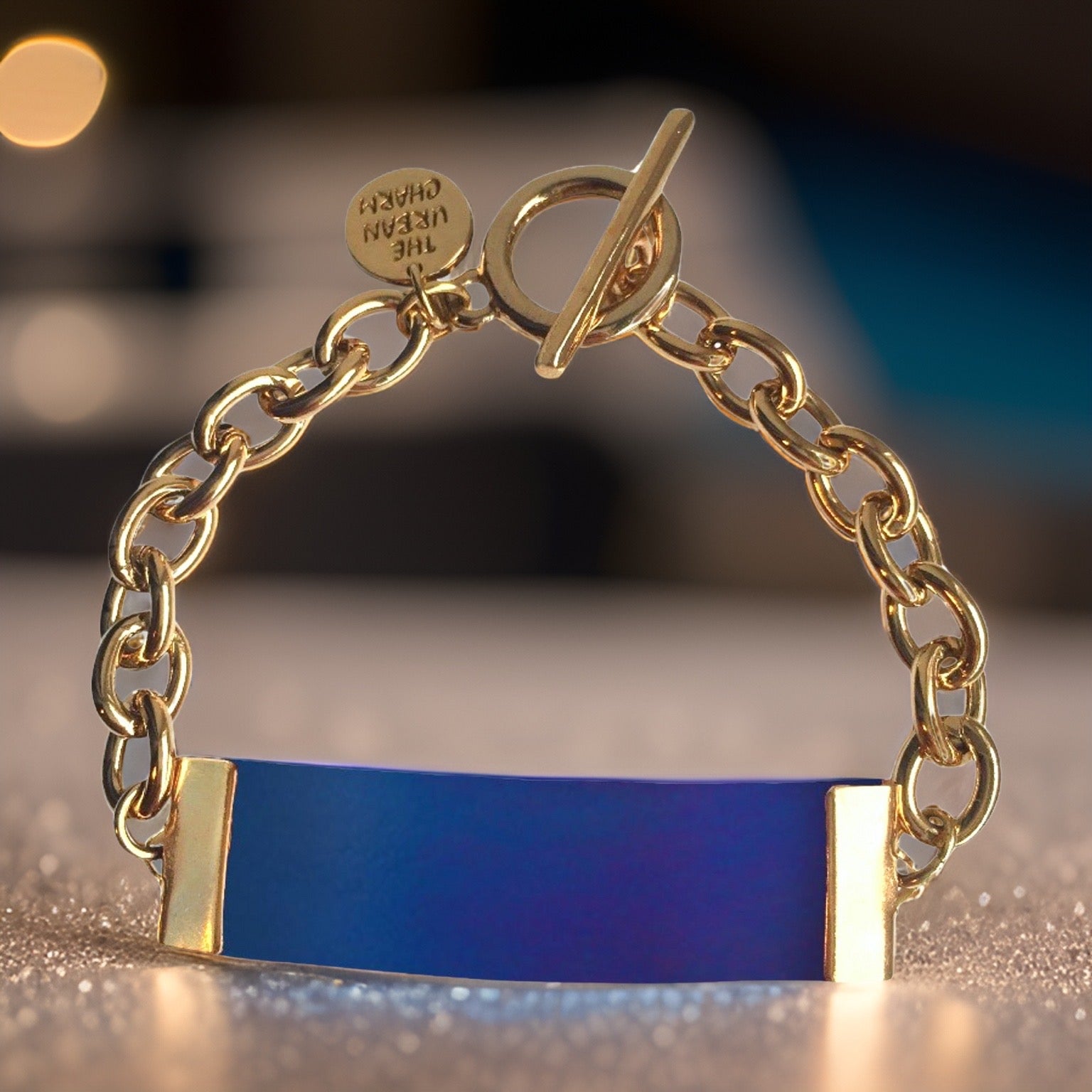 The blue leather ID bracelet is our version of a modern ID bracelet. You can brand these with your initials or small name. The bracelet features genuine leather and a cable chain dipped in 24k gold or silver. It has a toggle closure for easy on and off accessibility and closed off with a branded logo charm.