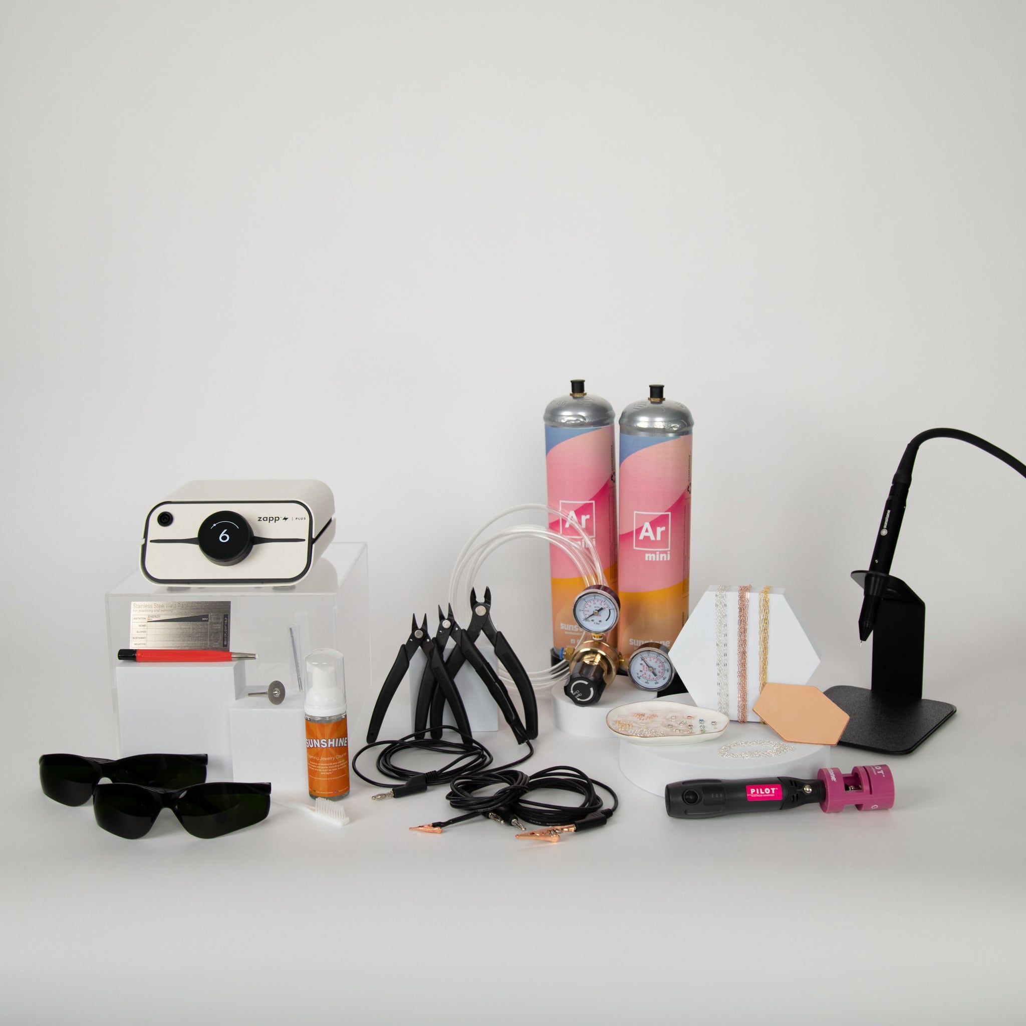 In addition to the training, the Zapp Plus® 2 Chrome Permanent Jewelry Starter Kit includes essential tools like the argon mini® tanks and a mini argon regulator.