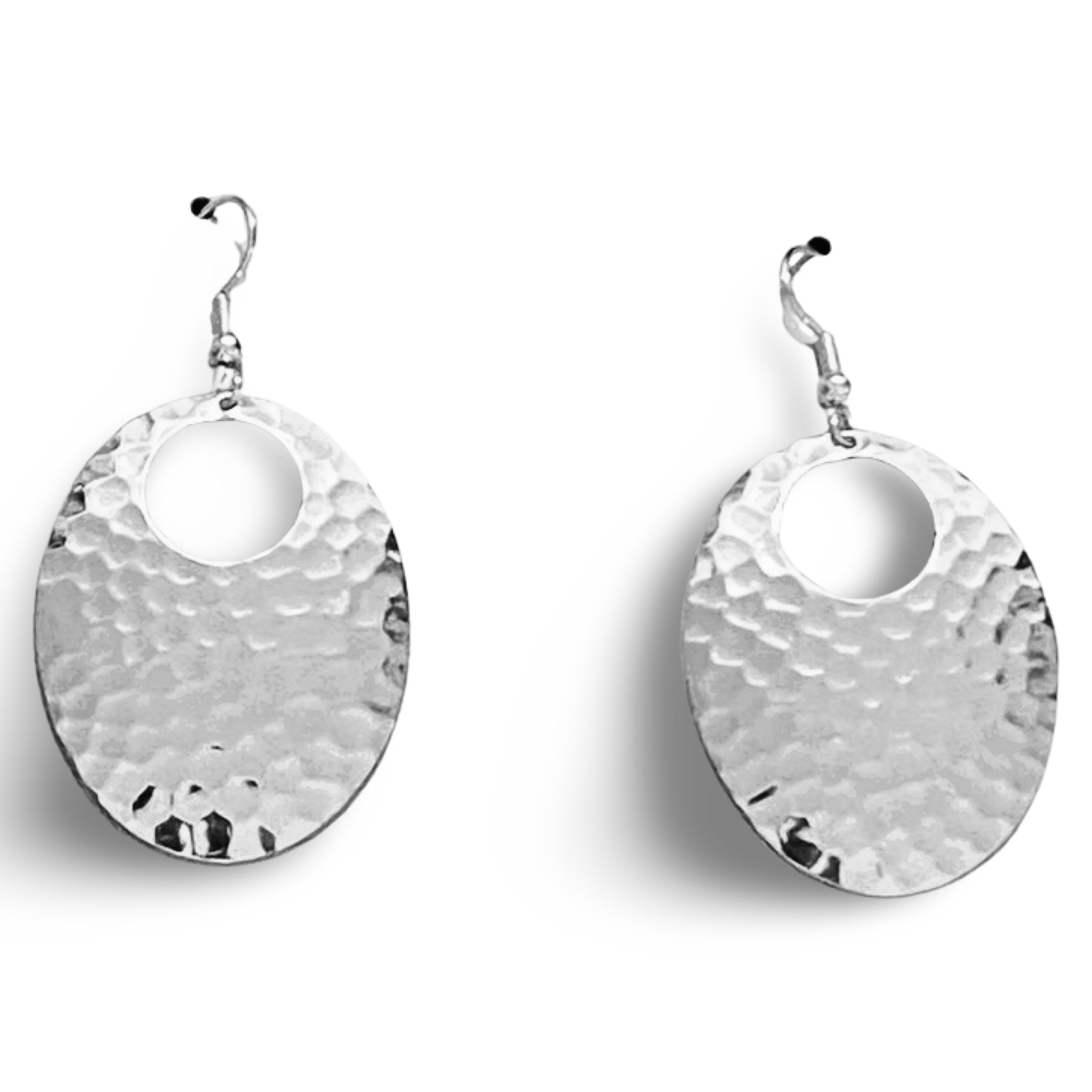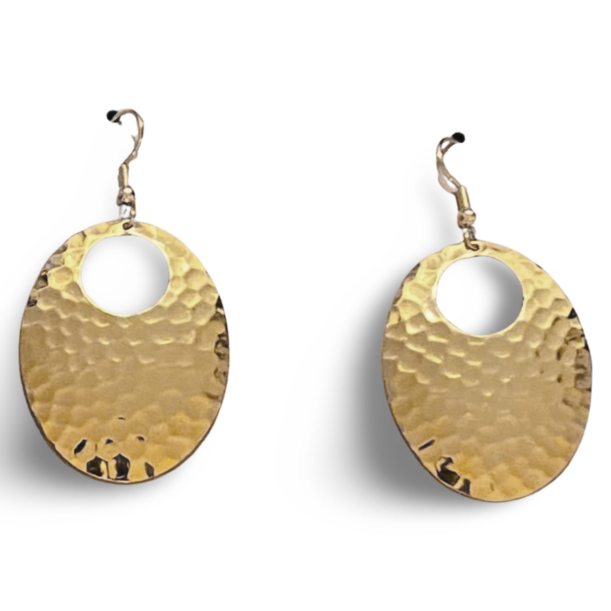 The hammered earrings come in oval and Diamond shape. They are lightweight and can dress up your outfit or can be paired with some brands and a T-shirt. They shimmer in the light and sparkle from far away.