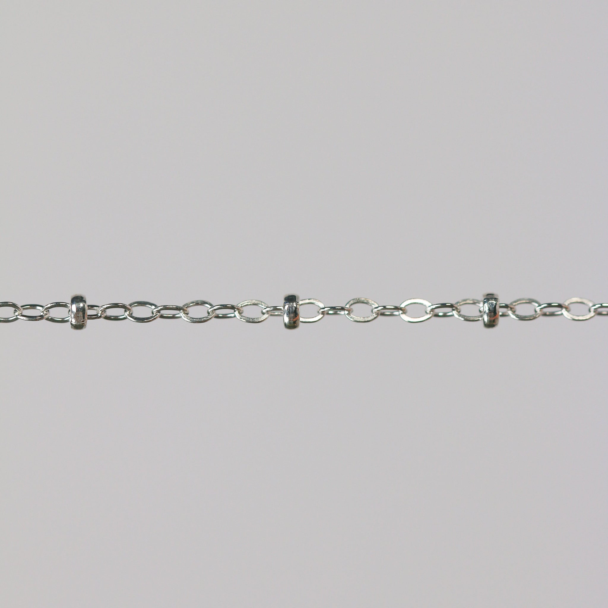 This flat oval cable chain features small beads spaced along the length in a tin-cup style, offering subtle sparkle and tactile texture while maintaining a low-profile, elegant silhouette. Its refined construction makes it versatile for everyday wear, layering with other pieces, or serving as a delicate base for a pendant.