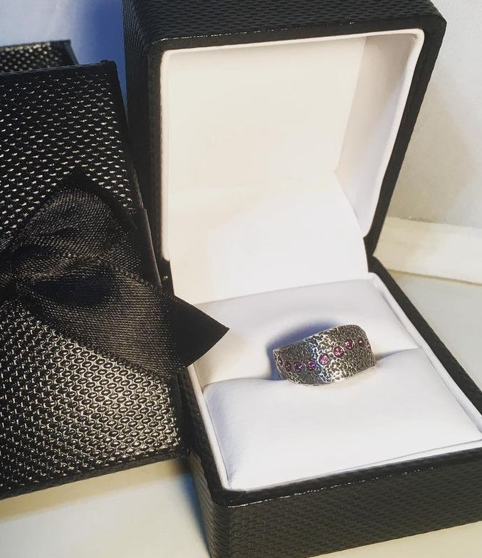 The Urban Charm Sandy ring is hand sculpted and features Crystal elements The image features jet black crystal with an antique silver finish.