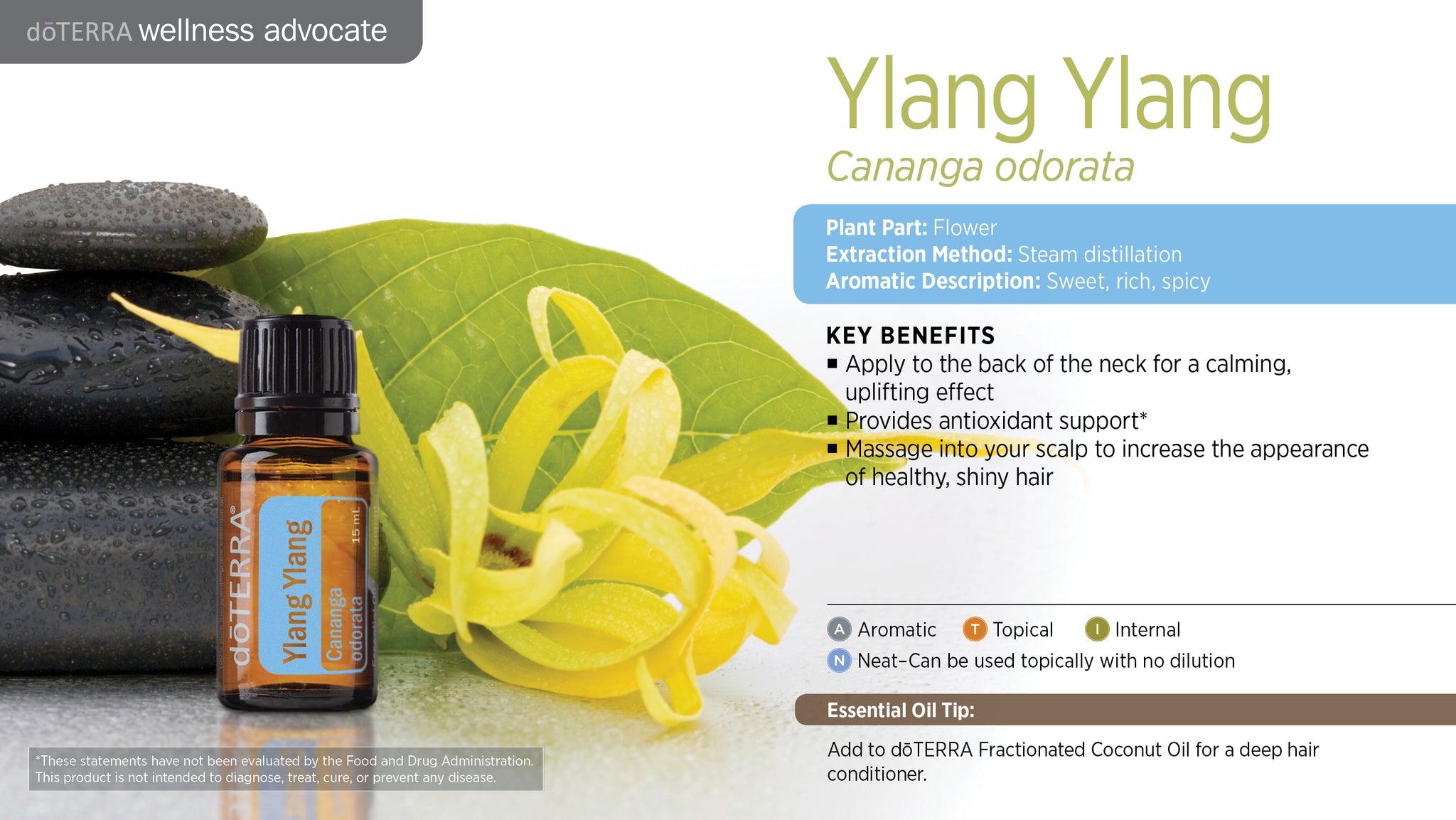 "In aromatherapy, Ylang Ylang is used to lessen tension and stress and to promote a positive outlook...Taken internally, Ylang Ylang provides antioxidant support."